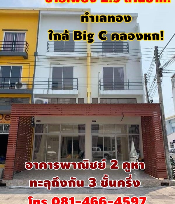 อาคารพาณิชย์ 2 คูหา ทะลุถึงกัน 3 ชั้นครึ่ง ห้องหัวมุม สภาพใหม่ ทำเลทอง ใกล้ Big C คลองหก!